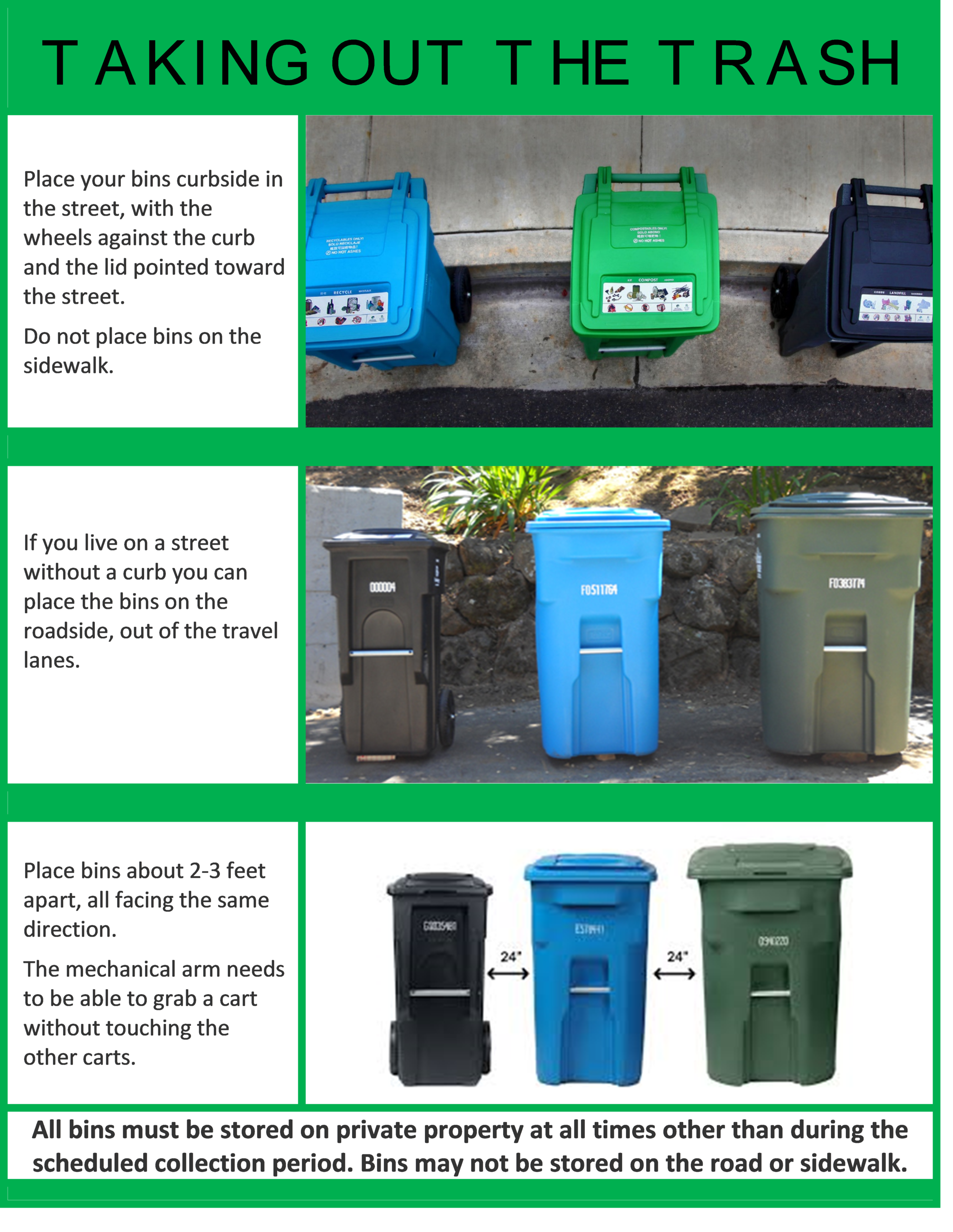 Garbage bins can also block public walkways, and the way you place them can make it easier for garbage trucks to pick them up and move on to the next residence. Place bins at the street only on the day before and on the day that pickup is scheduled. Bins may not be stored in the roadway or on the sidewalk. Do not leave bins on the sidewalk as the full width of the sidewalk must be kept usable for pedestrians. Some pedestrians, especially those with disabilities, need to use the full width of the sidewalk. Here are some helpful tips.